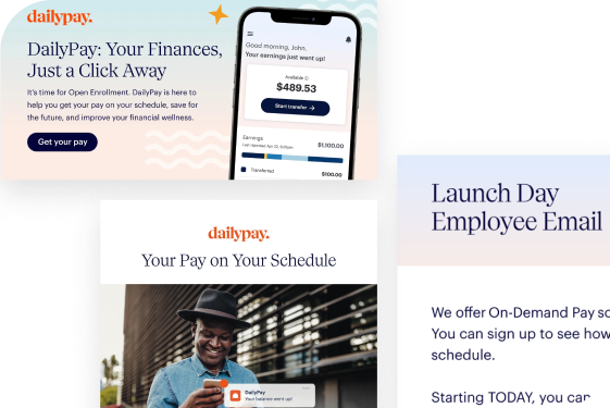 With DailyPay your employees get control over their pay without adding extra work for your payroll l team. Our suite of powerful tools makes it easy to manage your DailyPay program, access valuable insights, and enhance your business operations.