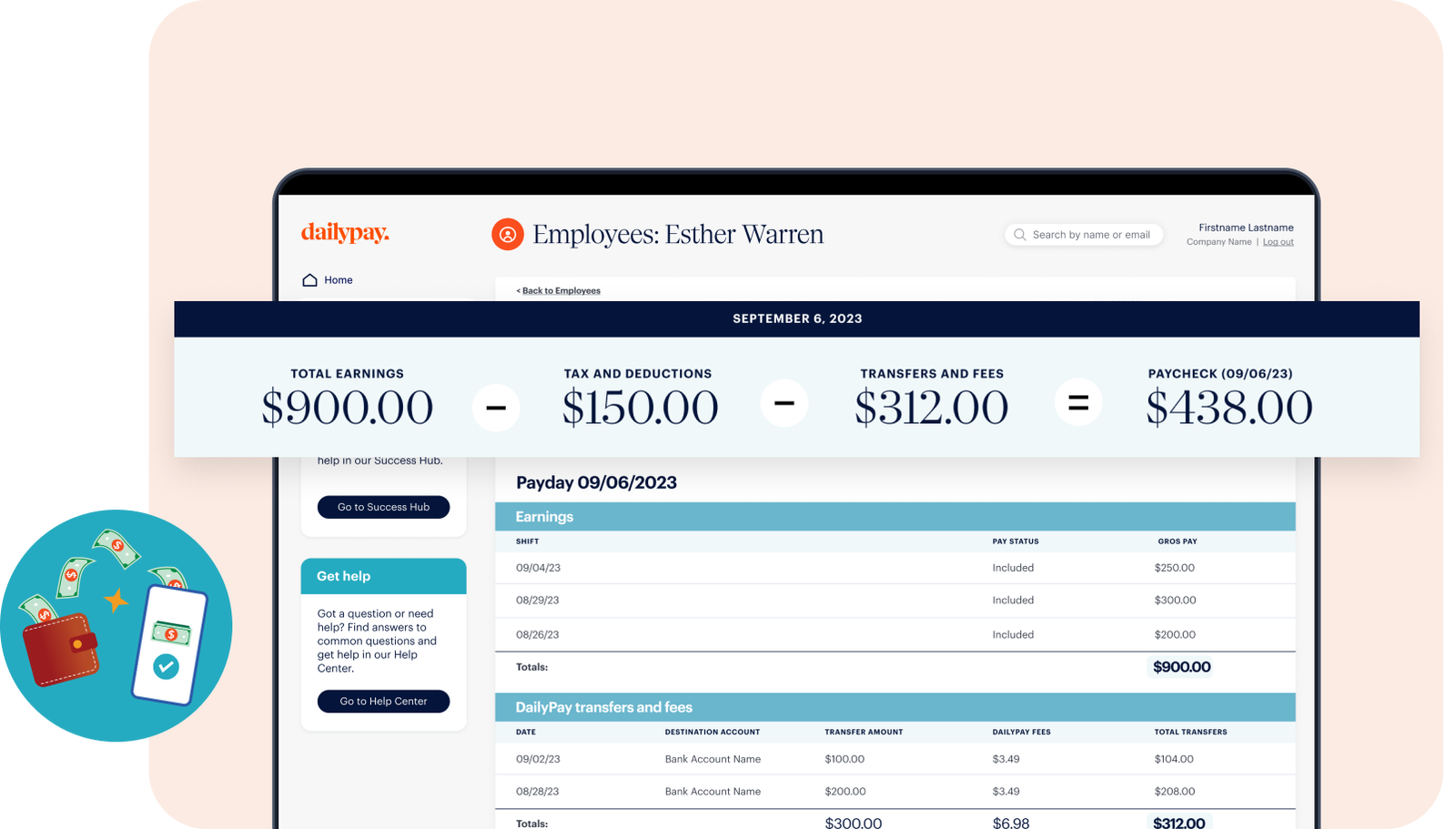 Users can access their earned pay through multiple no-fee transfer options, or for a small fee they can instantly transfer to their existing bank account or debit card.** **** Whatever they do not transfer gets sent to them automatically on payday