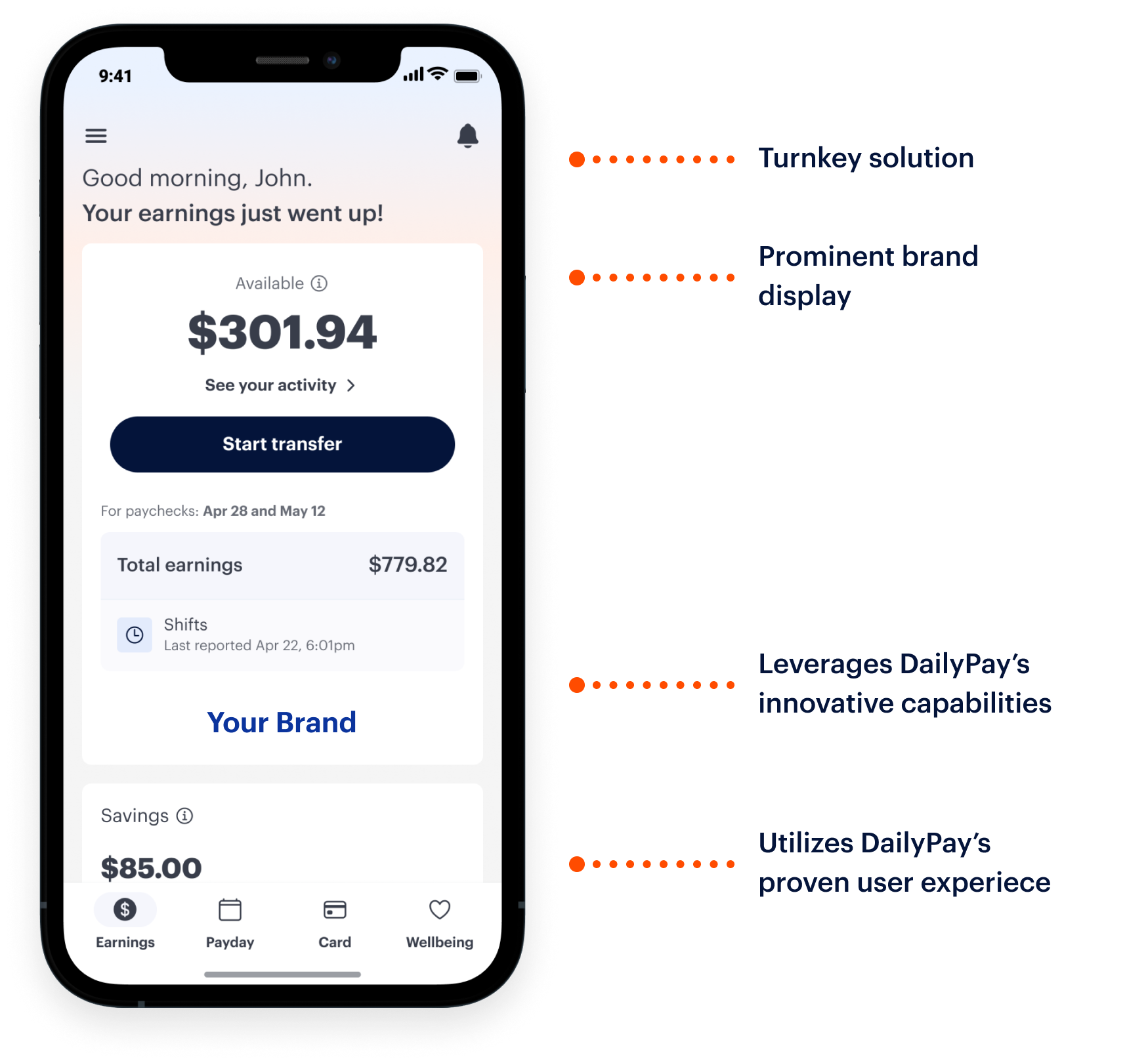 A turnkey solution with no technical build and a fast go-to-market, our white label solution enables you to offer gold-standard On-Demand Pay technology with your own branding.